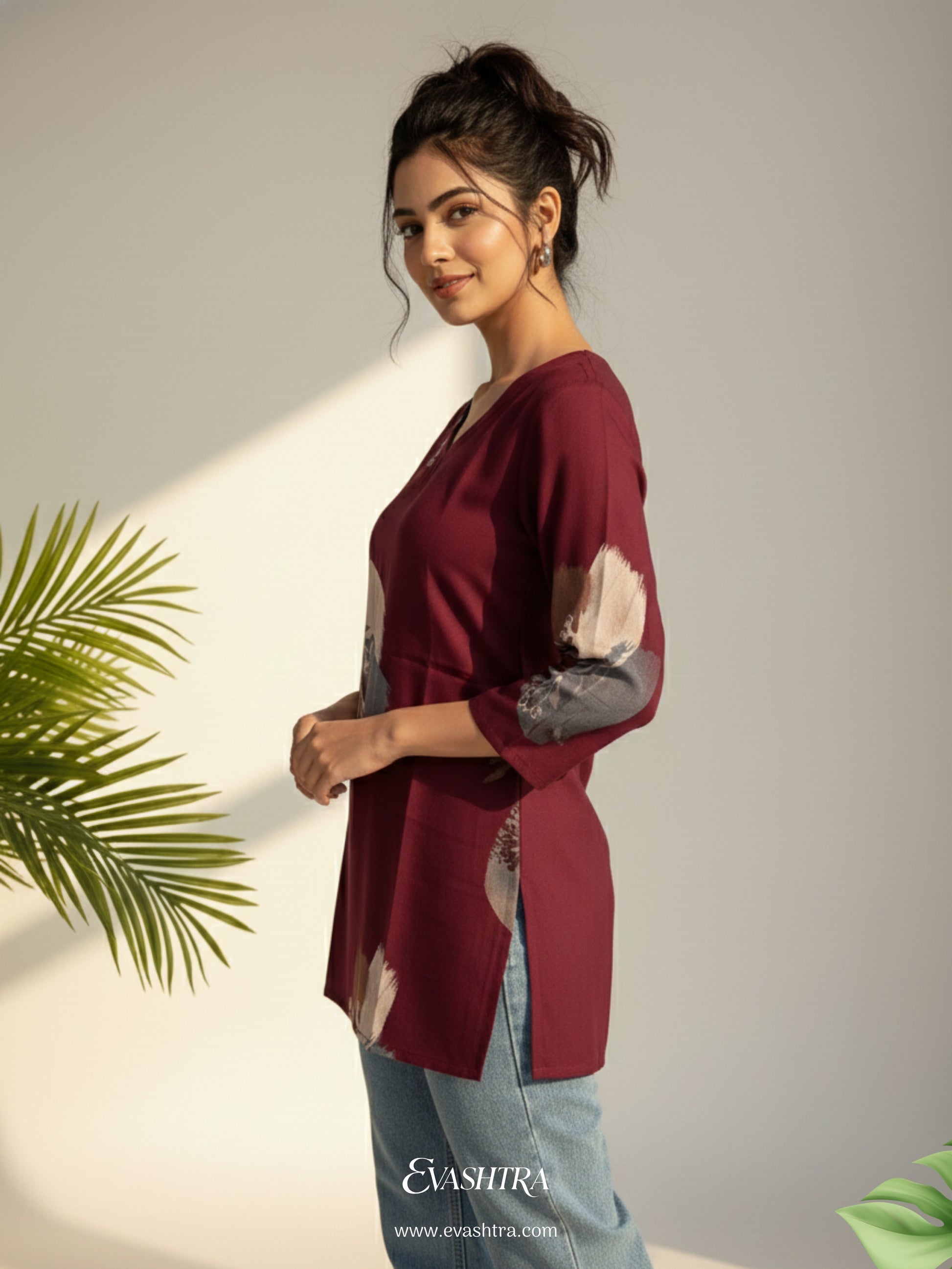 Rich, elegant, and artistically bold. This deep wine tunic is crafted from premium soft rayon, offering a fluid drape that flatters every silhouette. The design features contemporary abstract brush strokes overlaid with delicate botanical line work, creating a modern fusion look. With a smart V-neckline and breathable ¾ sleeves, this piece is perfect for pairing with light denim or beige trousers for a standout casual or semi-formal look.