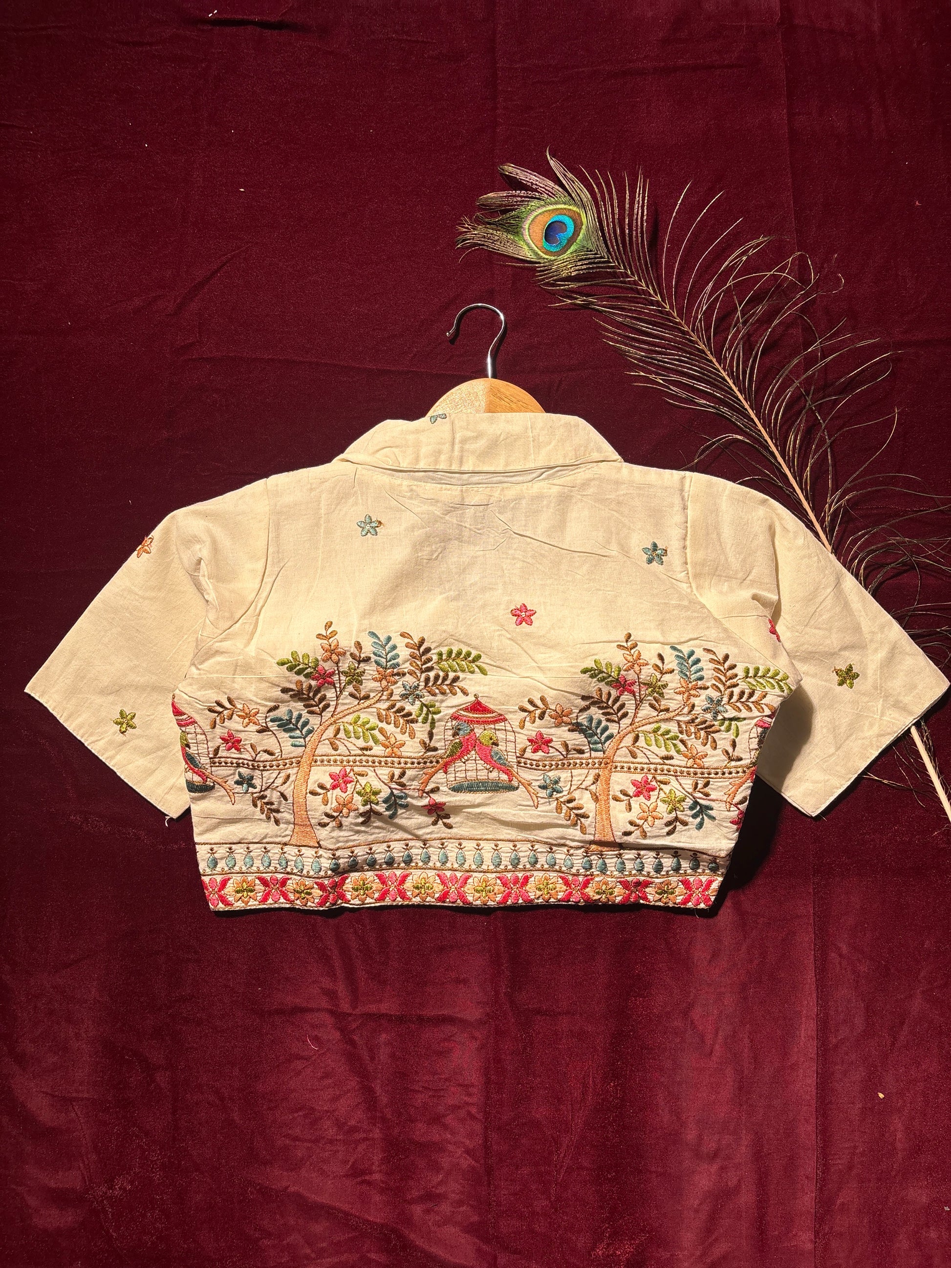 Step into elegance with our handcrafted Evashtra embroidered blouse, designed for modern women who adore timeless ethnic charm. This cream-colored blouse features: