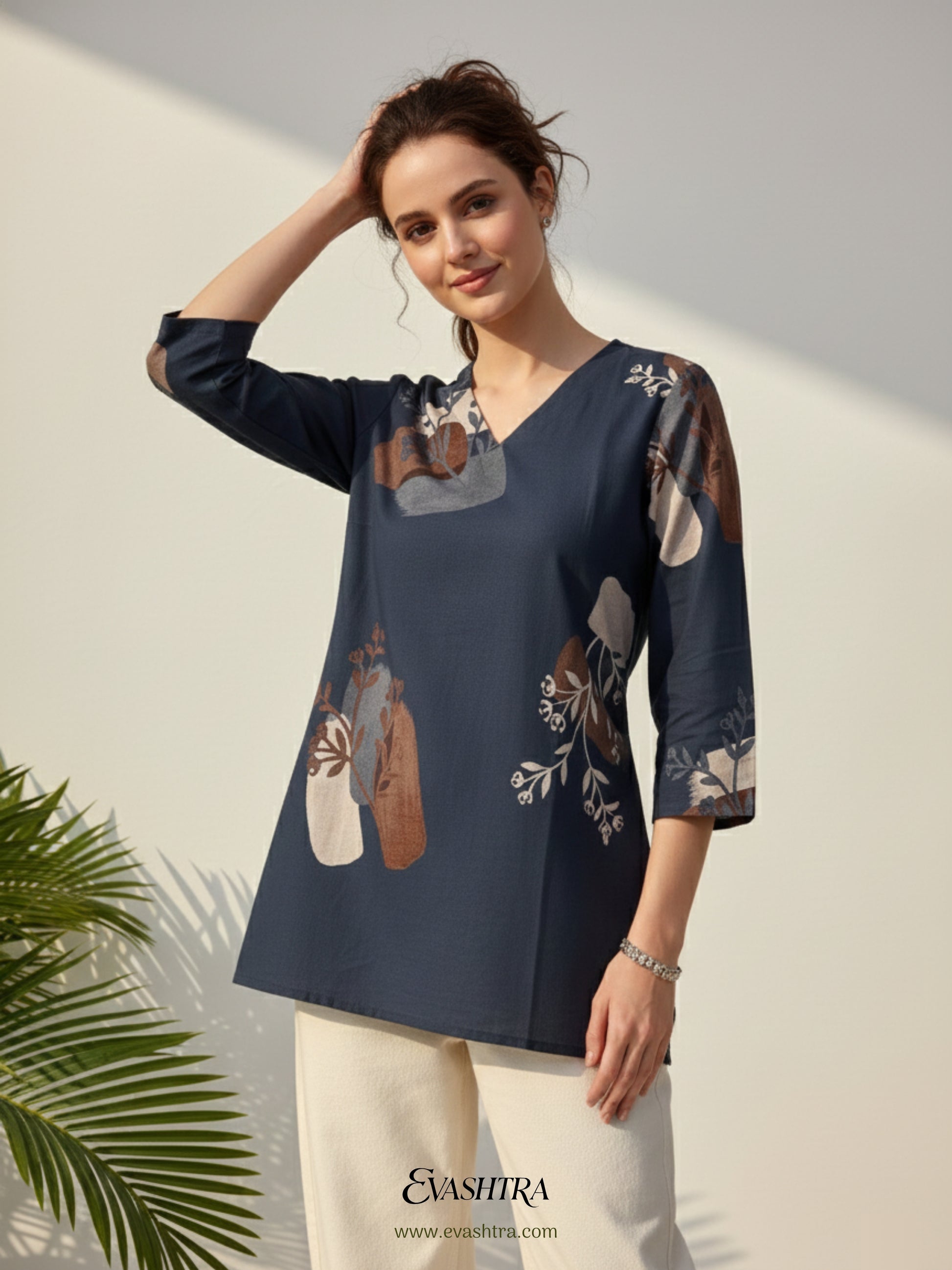 Fluid, soft, and artistically designed. This midnight blue tunic is crafted from smooth rayon fabric that offers a beautiful, flattering drape. Featuring a modern abstract botanical print in earthy tones, a sharp V-neckline, and comfortable three-quarter sleeves, it provides a relaxed yet polished look. The flowy silhouette pairs perfectly with cream trousers or fitted denim for an effortless day-to-night ensemble.