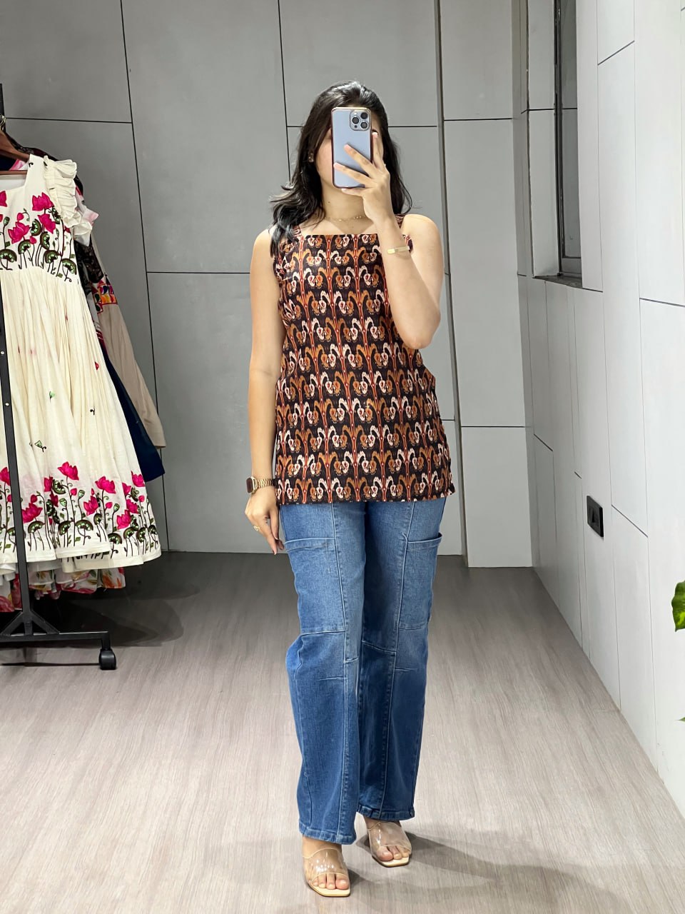 Women’s Ikat Print Sleeveless Cami Top – Brown/Black | Square Neck, Hip Length
